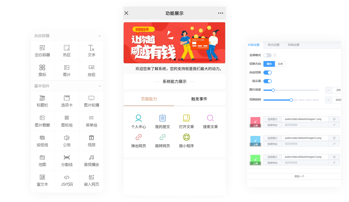 拖拽式装修体验,丰富样式属性设置 ,每个组件都是专属定制